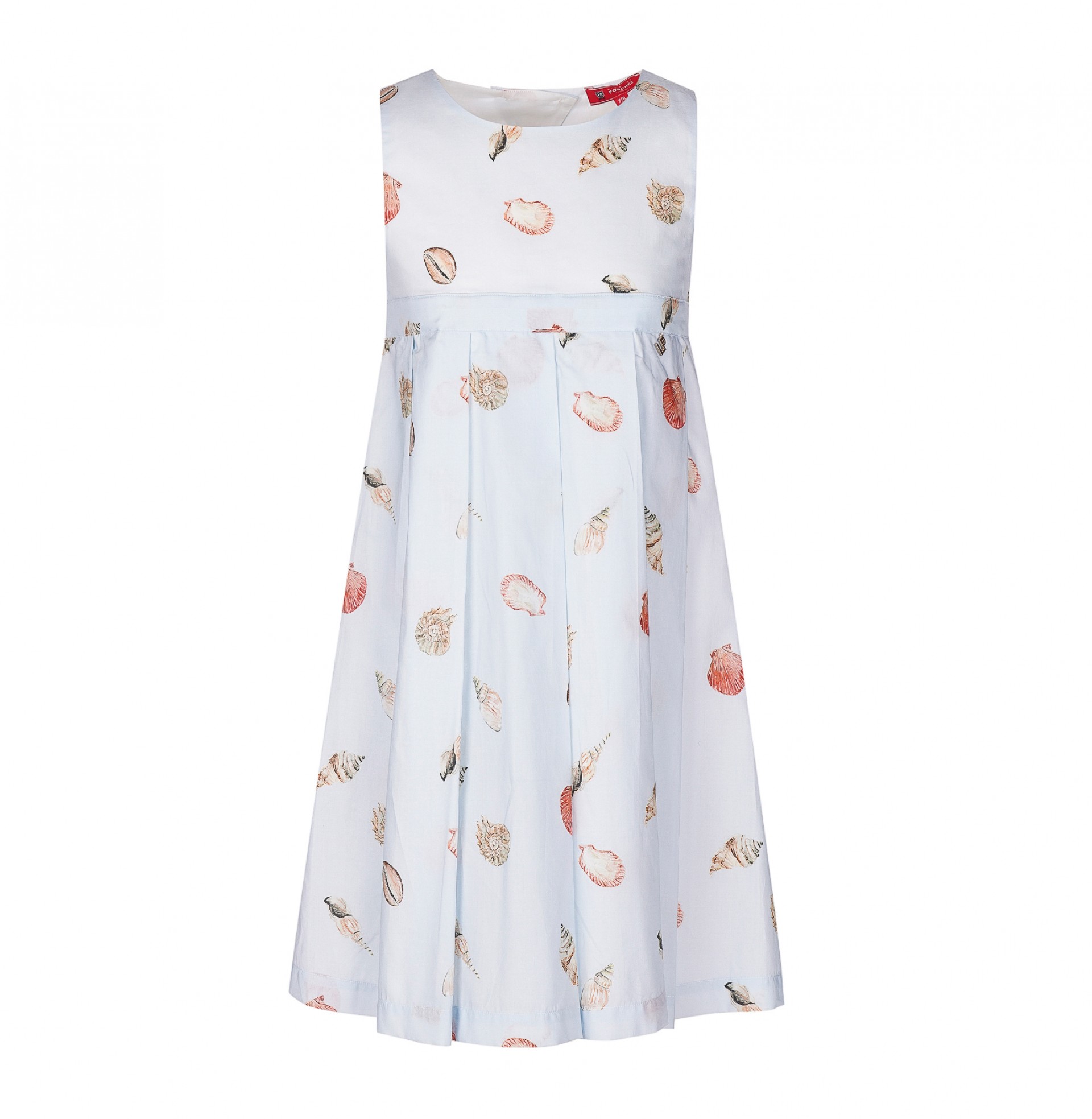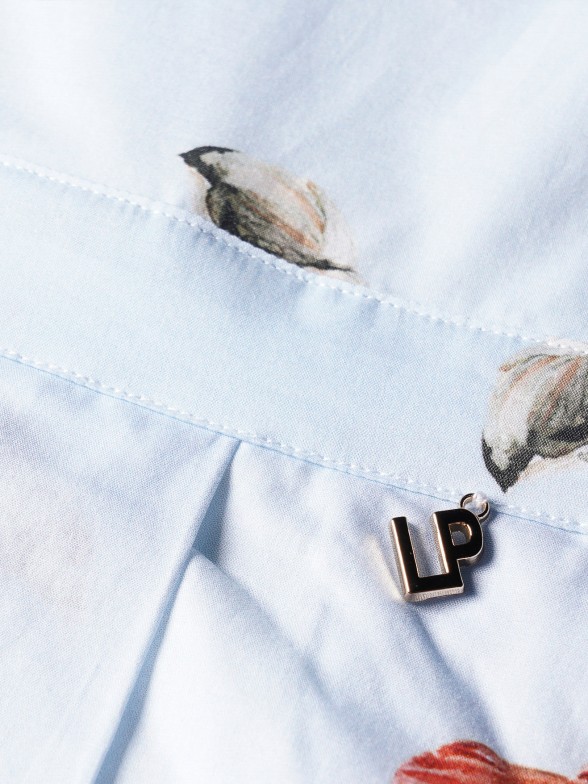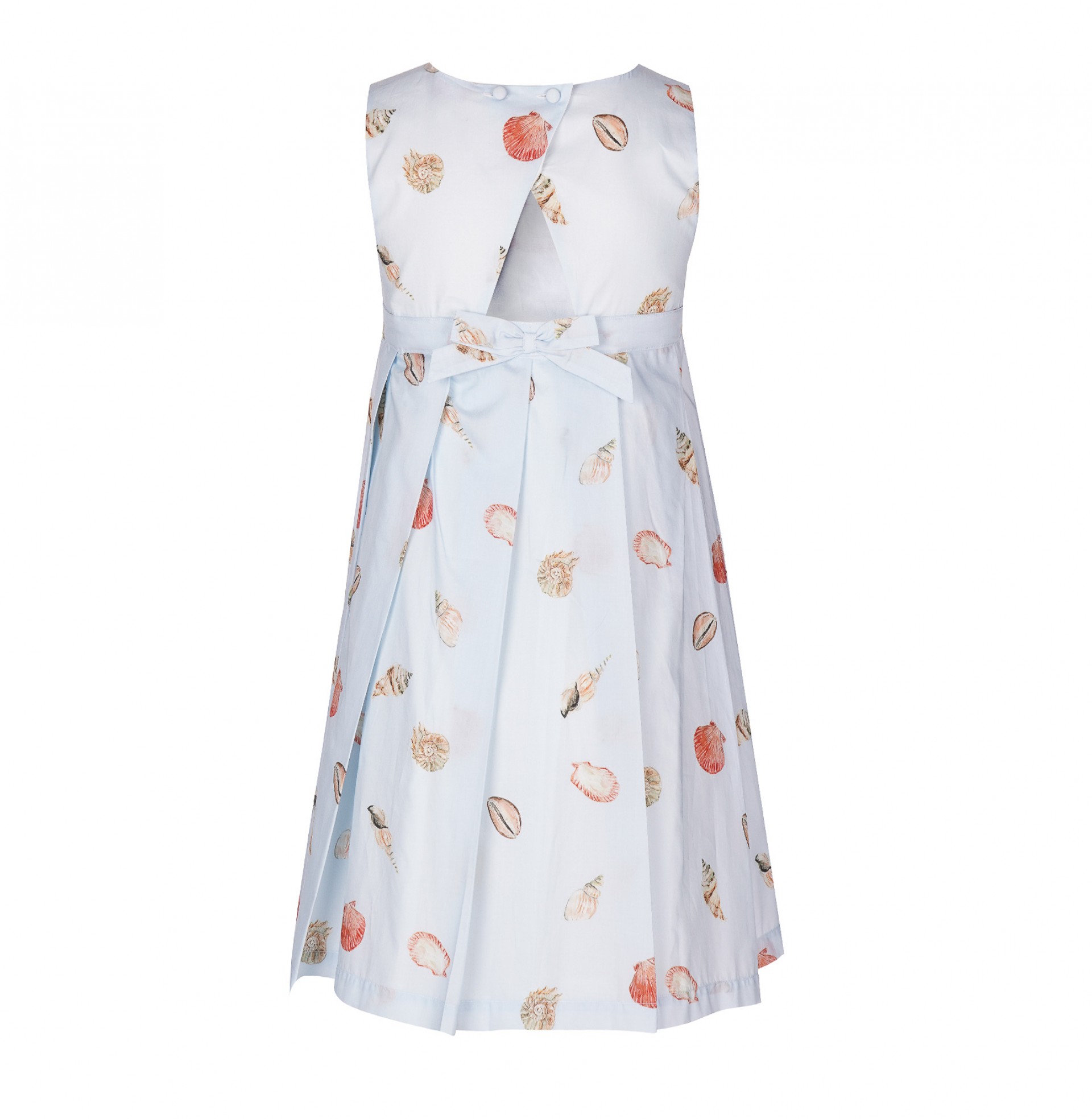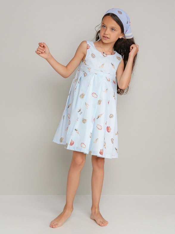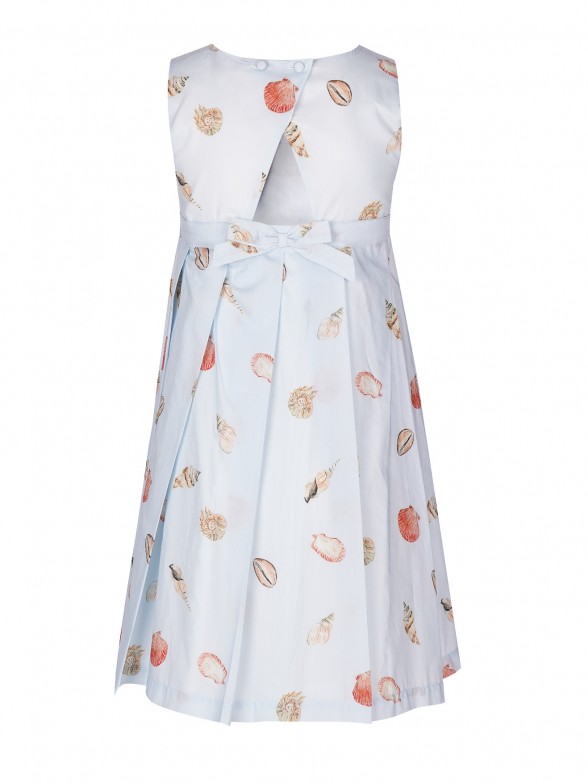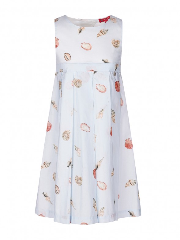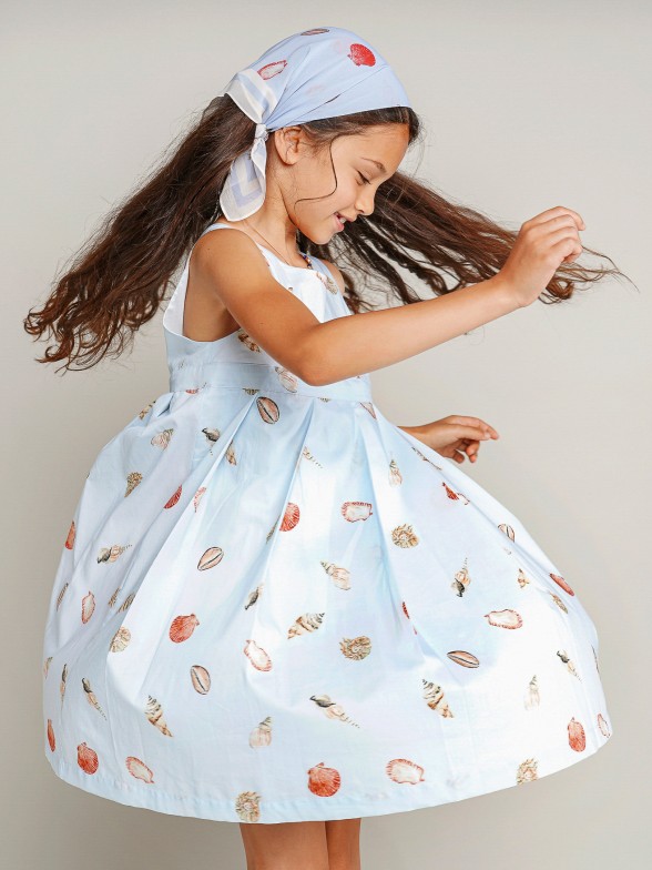 Las niñas van encantarse con este vestido de voile con estapado de conchas inspirado en paseos por la playa. Forrado, cortado en el pecho con la falda de pliegues anchos. Cierre cruzado de botones forrados y lazo en la espalda. Personalizado con «LP» metálico aplicado en la delantera. Completa el look con el pañuelo o accesorios de cabello de patrón igual.
