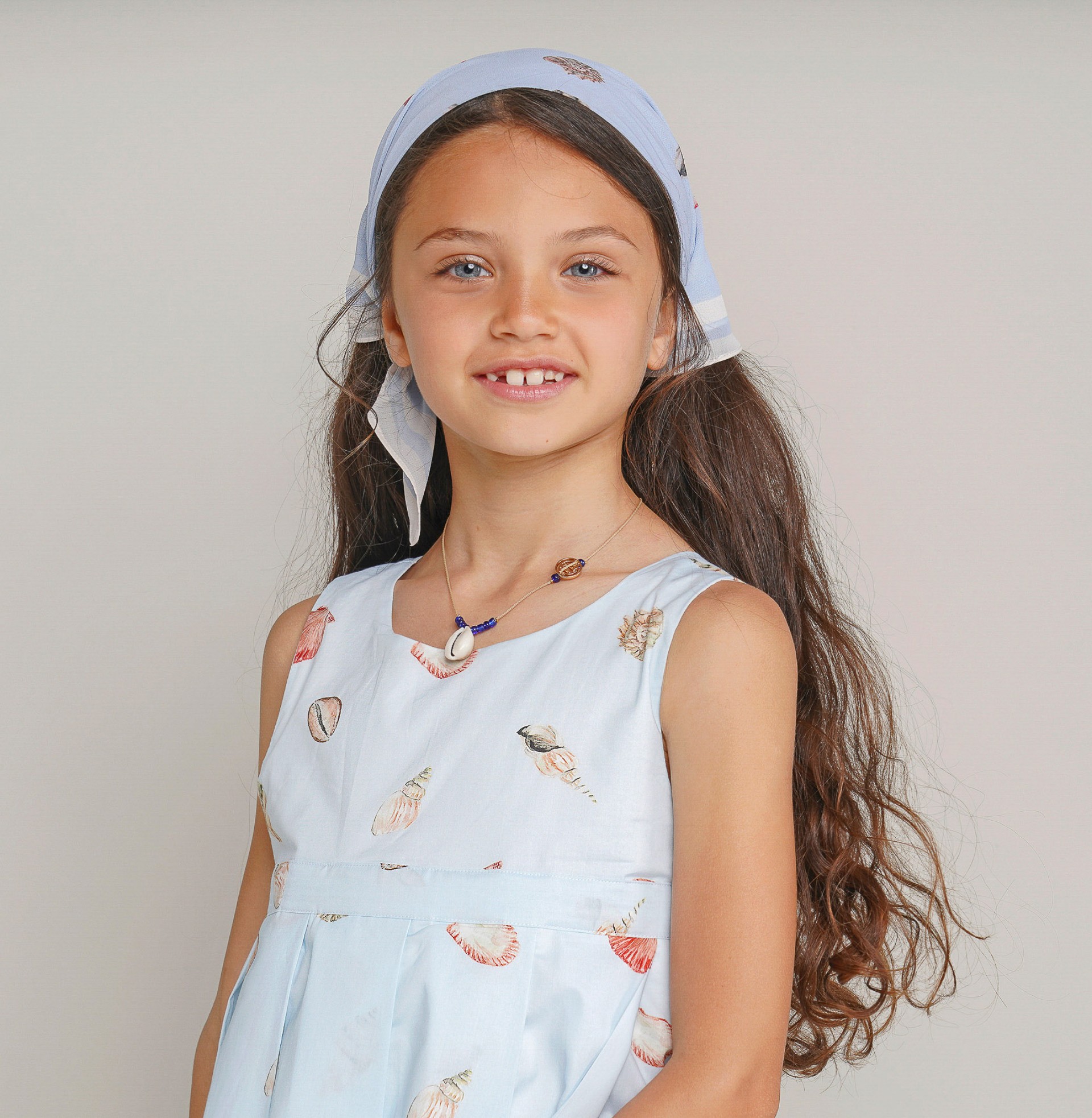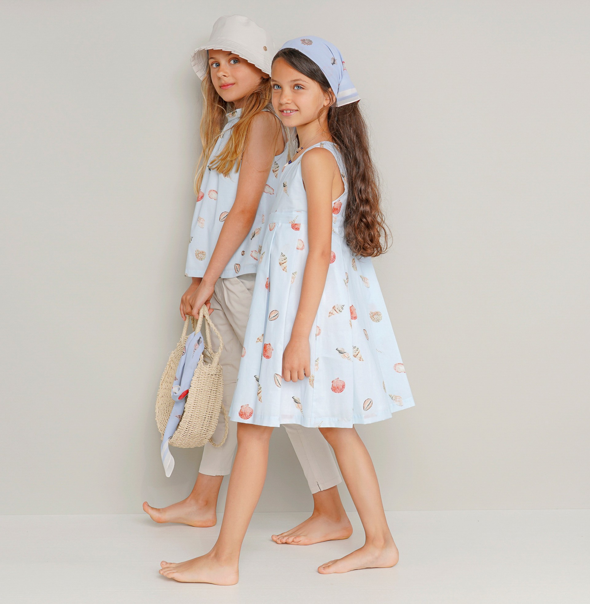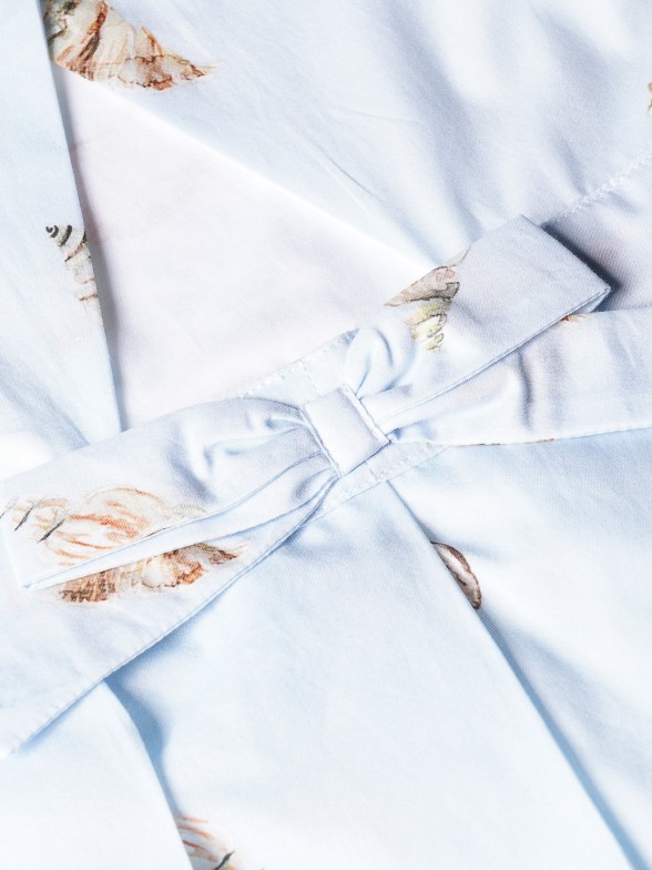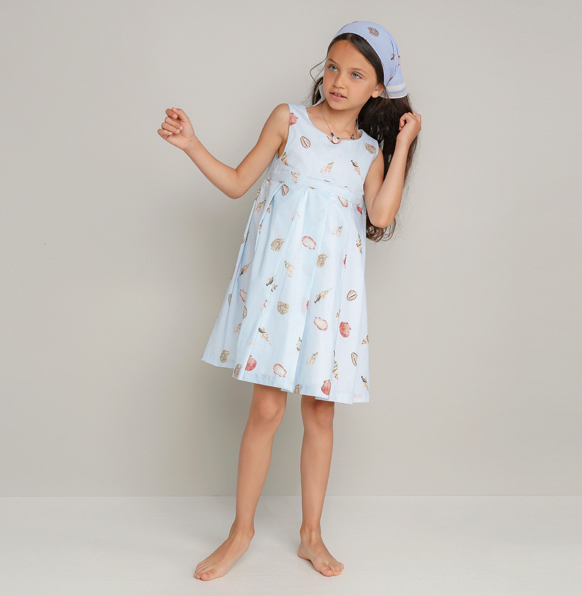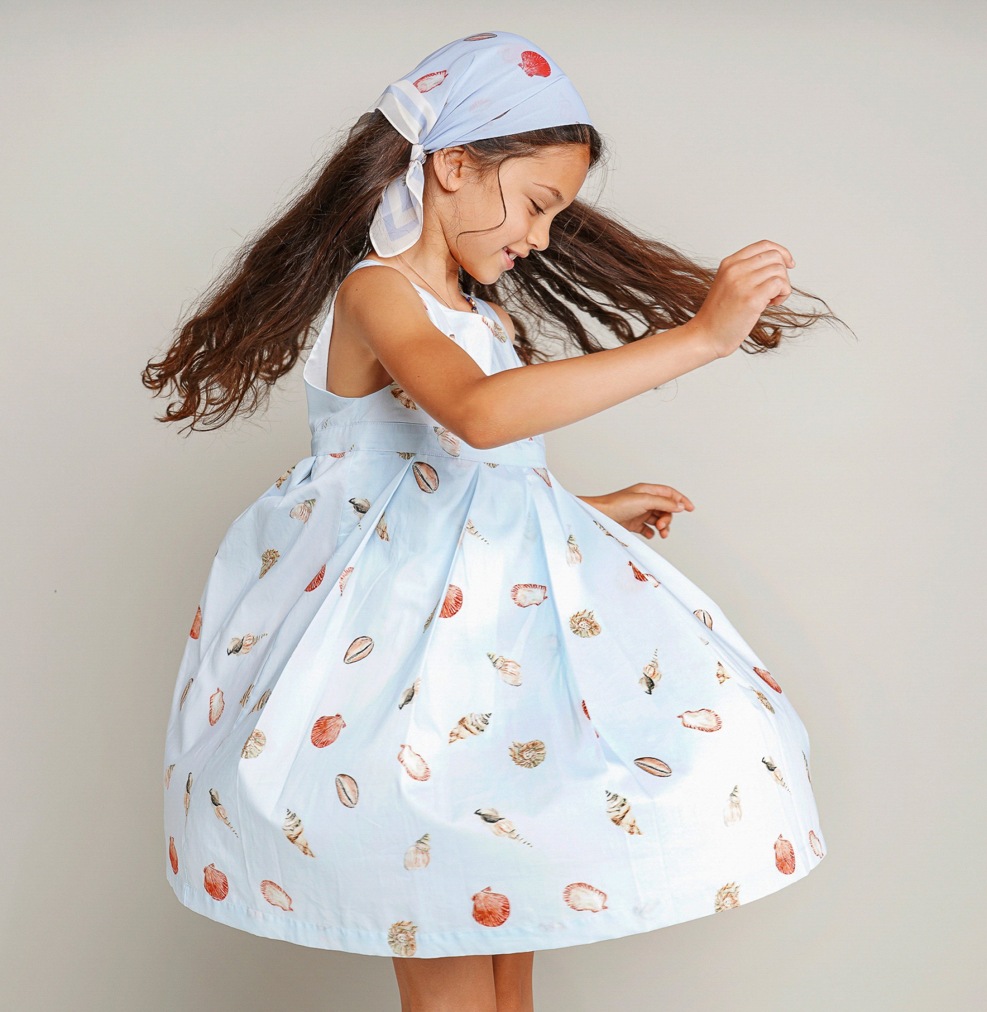 Las niñas van encantarse con este vestido de voile con estapado de conchas inspirado en paseos por la playa. Forrado, cortado en el pecho con la falda de pliegues anchos. Cierre cruzado de botones forrados y lazo en la espalda. Personalizado con «LP» metálico aplicado en la delantera. Completa el look con el pañuelo o accesorios de cabello de patrón igual.