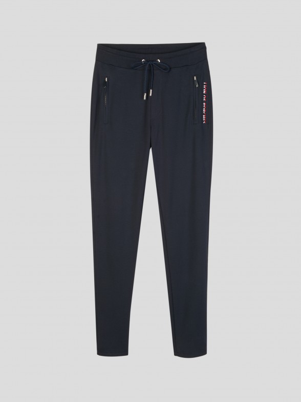 Joggers em felpa. Aplicação de fita de riscas tricolor corporativa da marca no interior das bainhas e dos bolsos traseiros. Cinto em canelado ajustável com cordões tricolores. Bolsos laterais com fecho zip. Personalizados com bordado tricolor "Lion of Porches" na frente lateral.