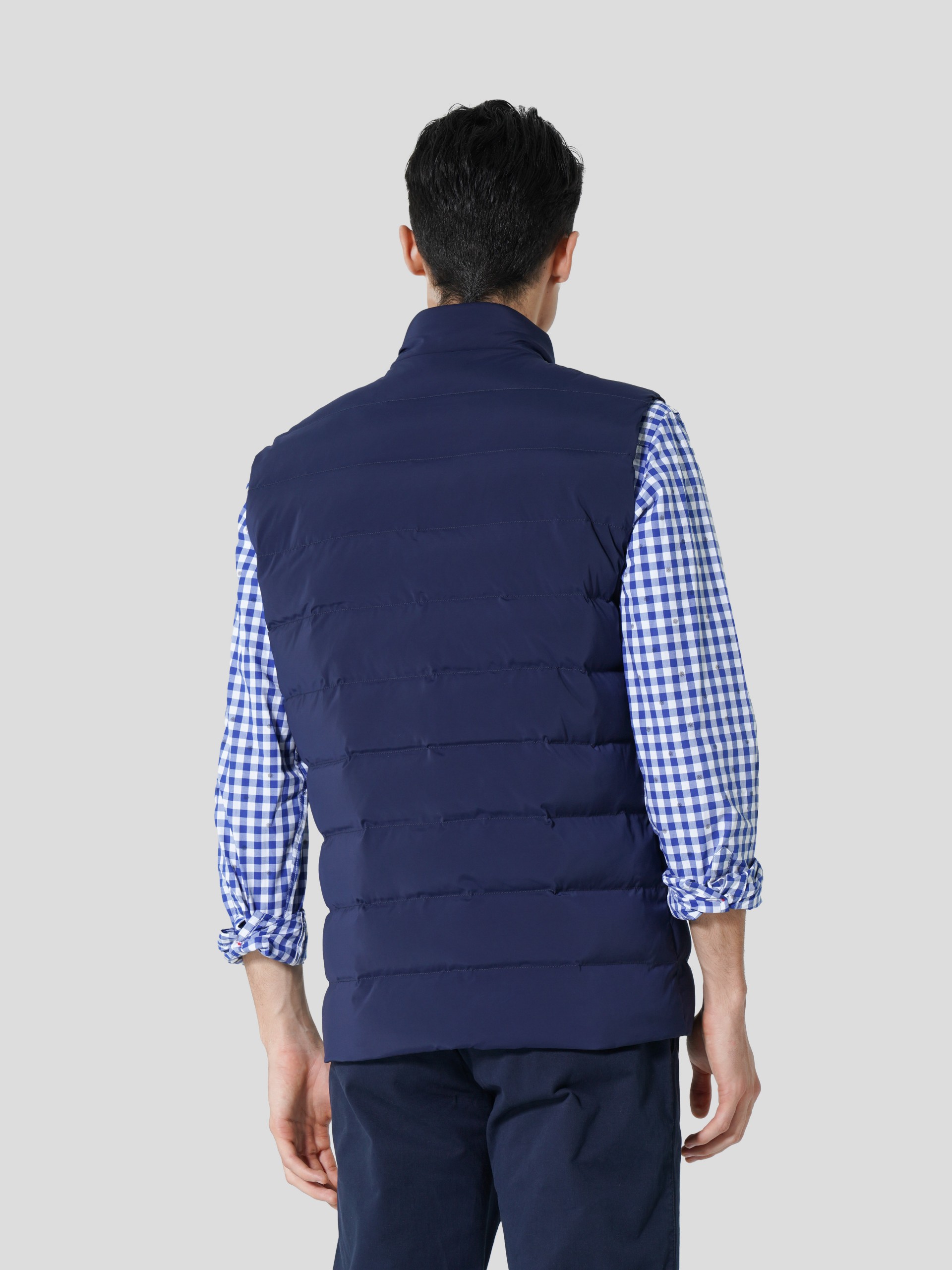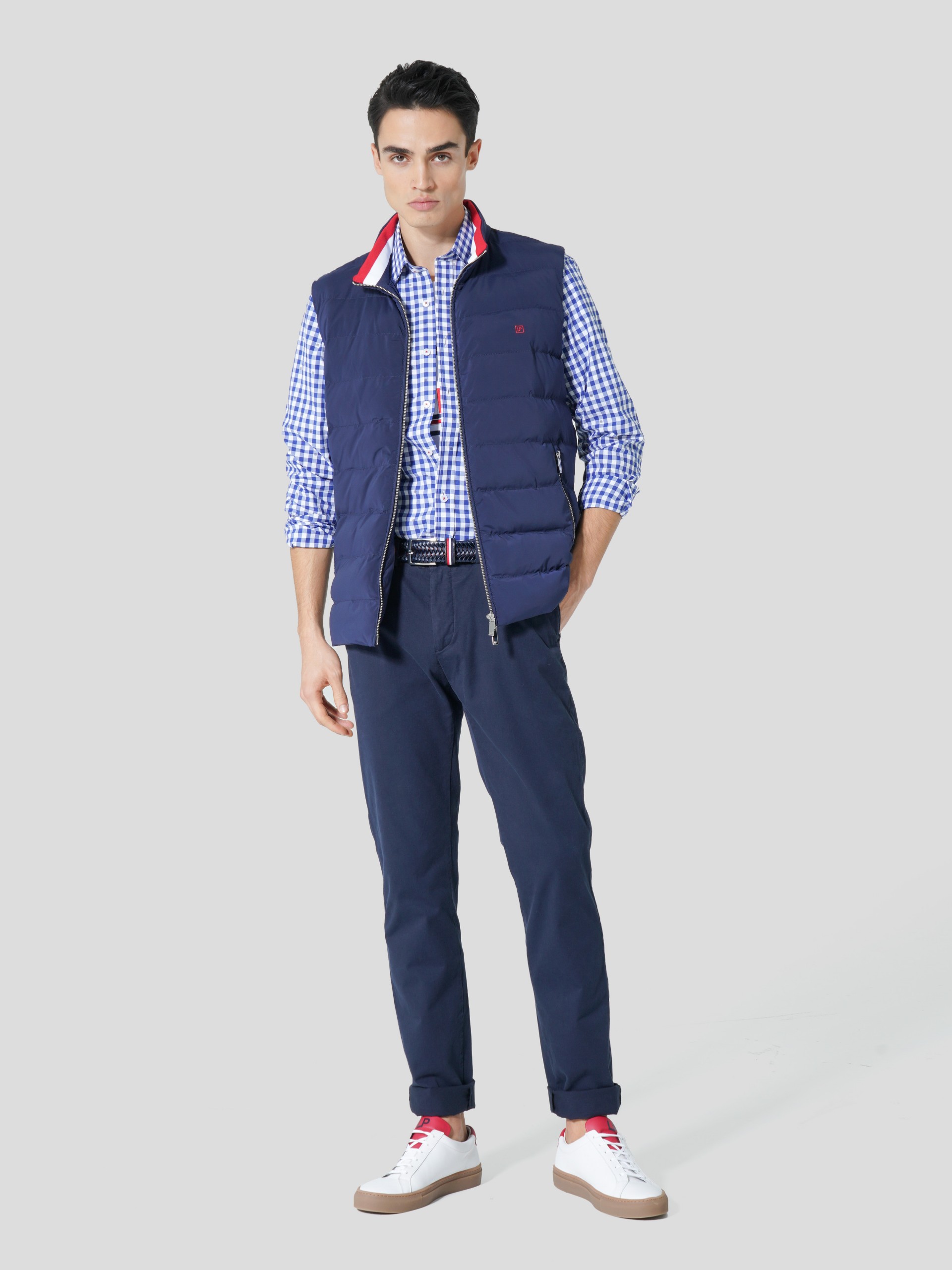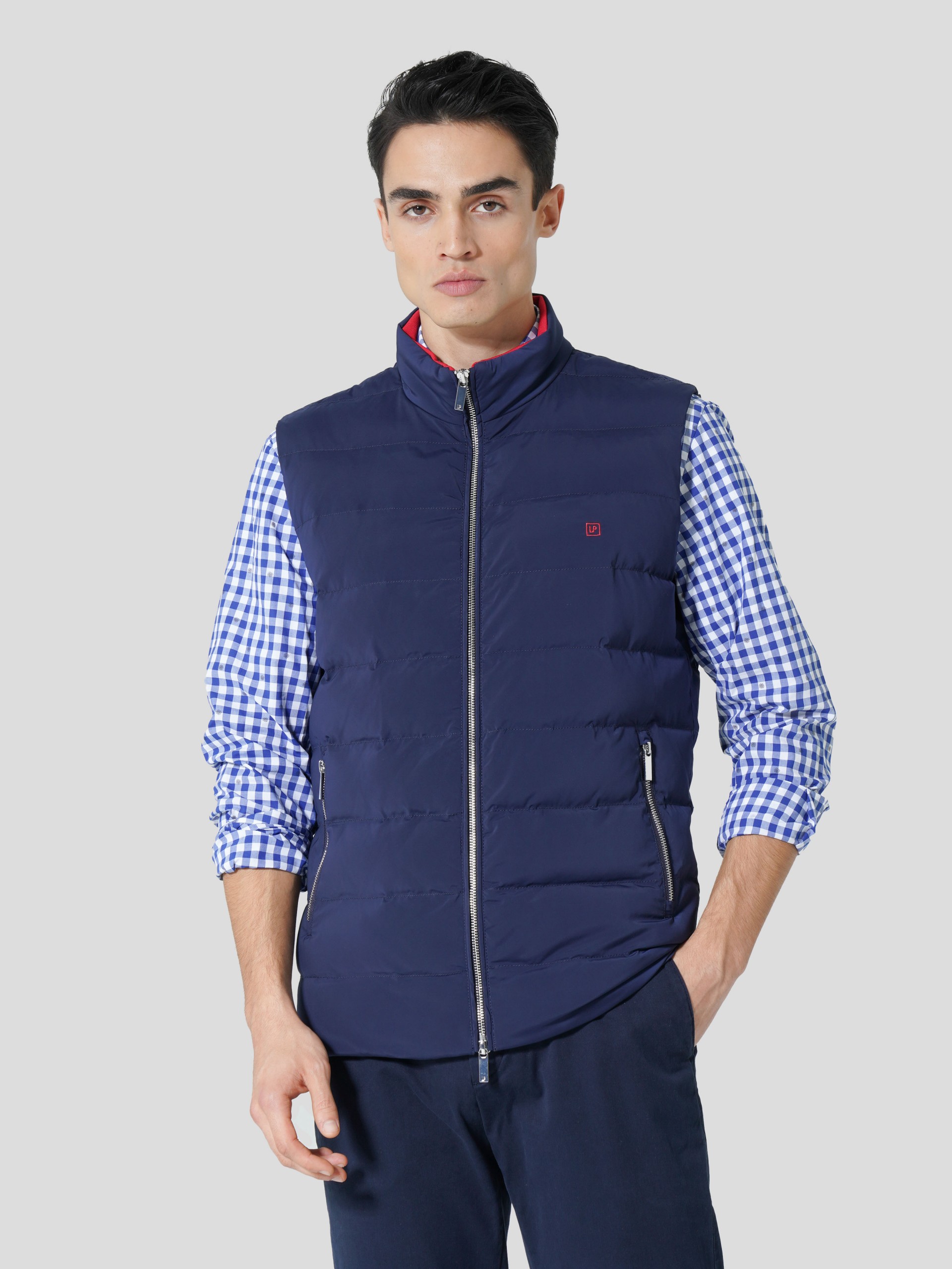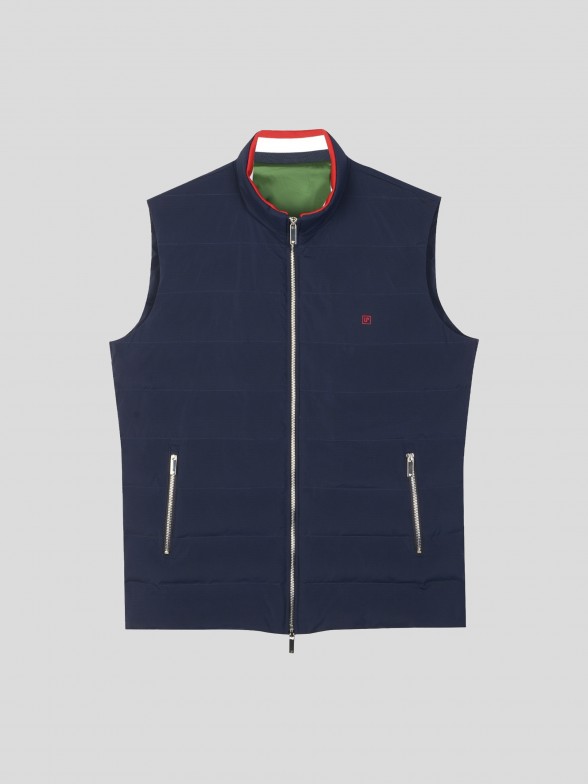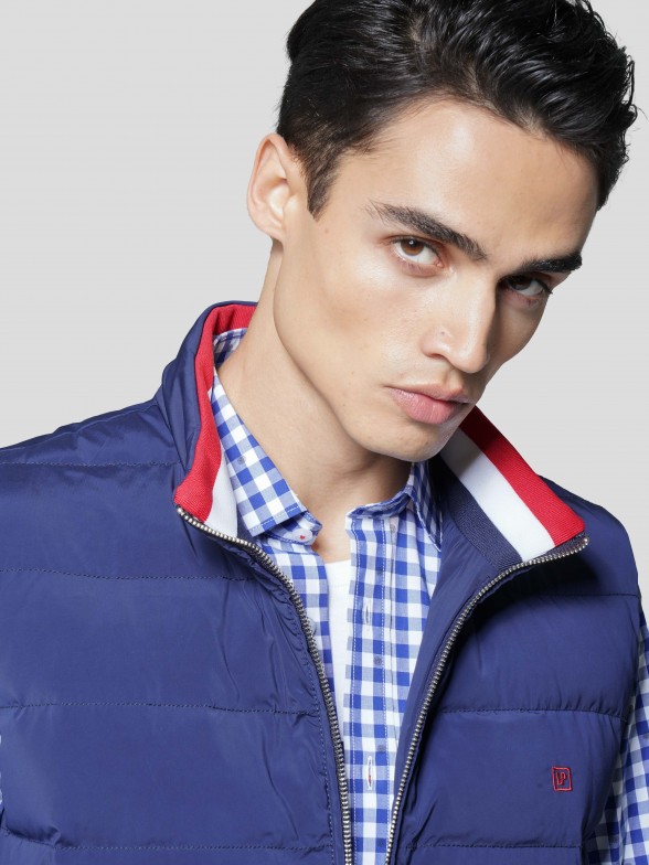 Colete acolchoado. Gola subida. Aperta com zip personalizado. Forro em cor contrastante. Bolsos laterais. Malha canelada no interior da gola com riscas tricolores. Personalizado com pequeno bordado no peito.